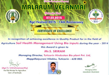 One of the best Organic Fertilizer company award received from Mr.RANGASAMY -Chief Minister of Puduchery in the year of 2014.